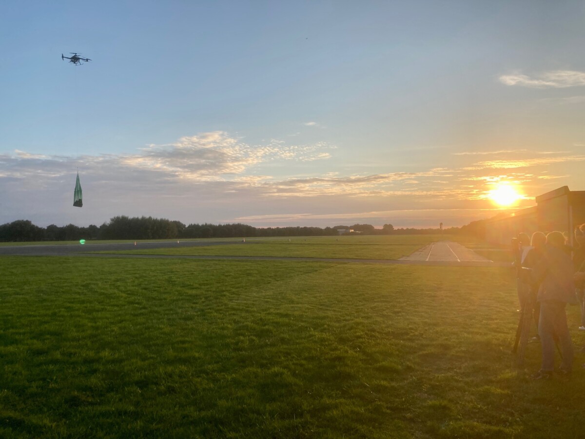 Nadat het vliegveld gesloten was werd er een demo gegeven van de drone van Drone Visual. Moeiteloos hief de drone 80 kg omhoog en vloog ermee over de baan. Joris legde ondertussen uit hoe e.e.a. bediend werd en wat de mogelijkheden waren. Iedereen was zichtbaar geïnteresseerd.